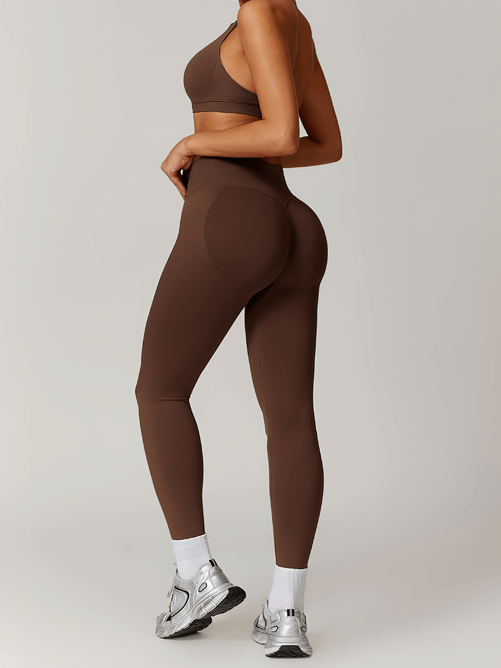 Trendy lange Leggings und sportliches Neckholder-Top-Kombination.