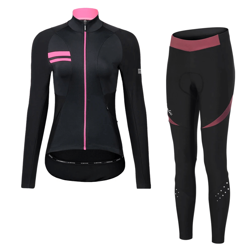 Atmungsaktives und warmes Set aus Fahrradtrikot und Radhose für Damen.