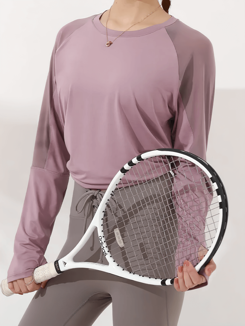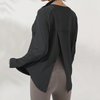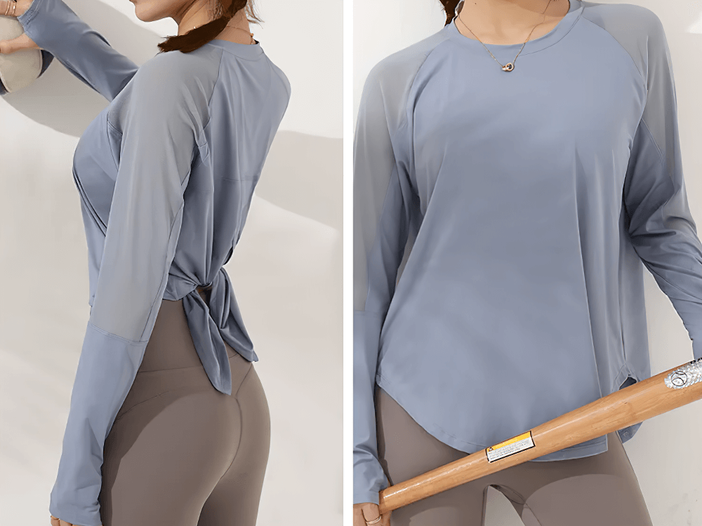 Bleiben Sie aktiv mit diesem lockeren Yoga-Shirt mit stilvollem gegabeltem Rückendesign. Dieses übergroße Gym-Oberteil mit atmungsaktiven Mesh-Einsätzen und langen Ärmeln ist perfekt für Herbstläufe, Yoga-Sitzungen oder das Training im Fitnessstudio. Seine entspannte Passform und das schweißableitende Material machen es ideal zum Tragen in mehreren Schichten oder allein während des Trainings.