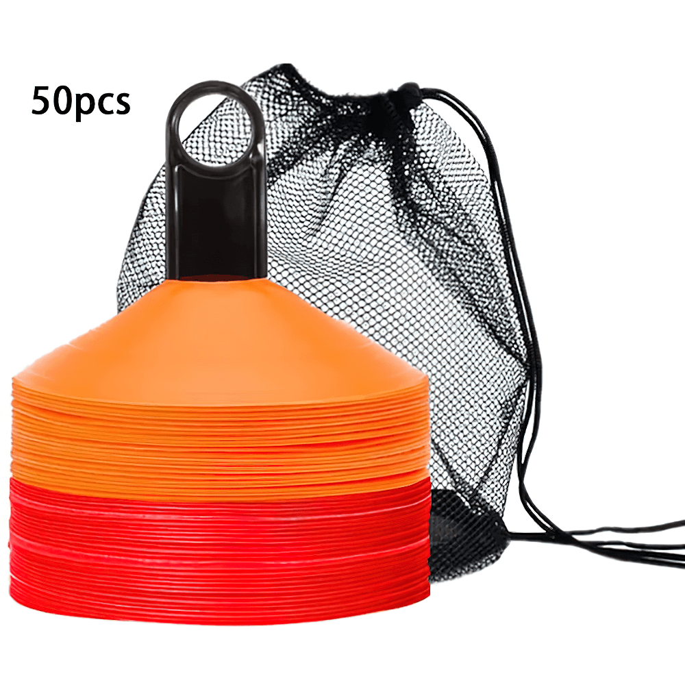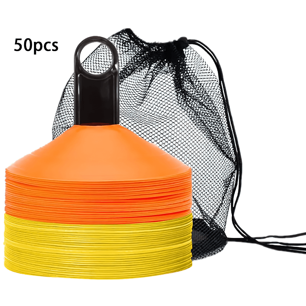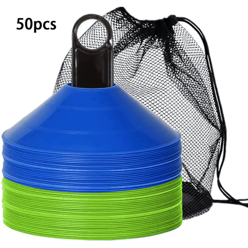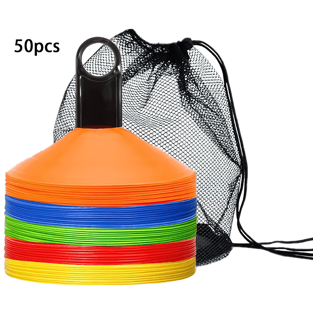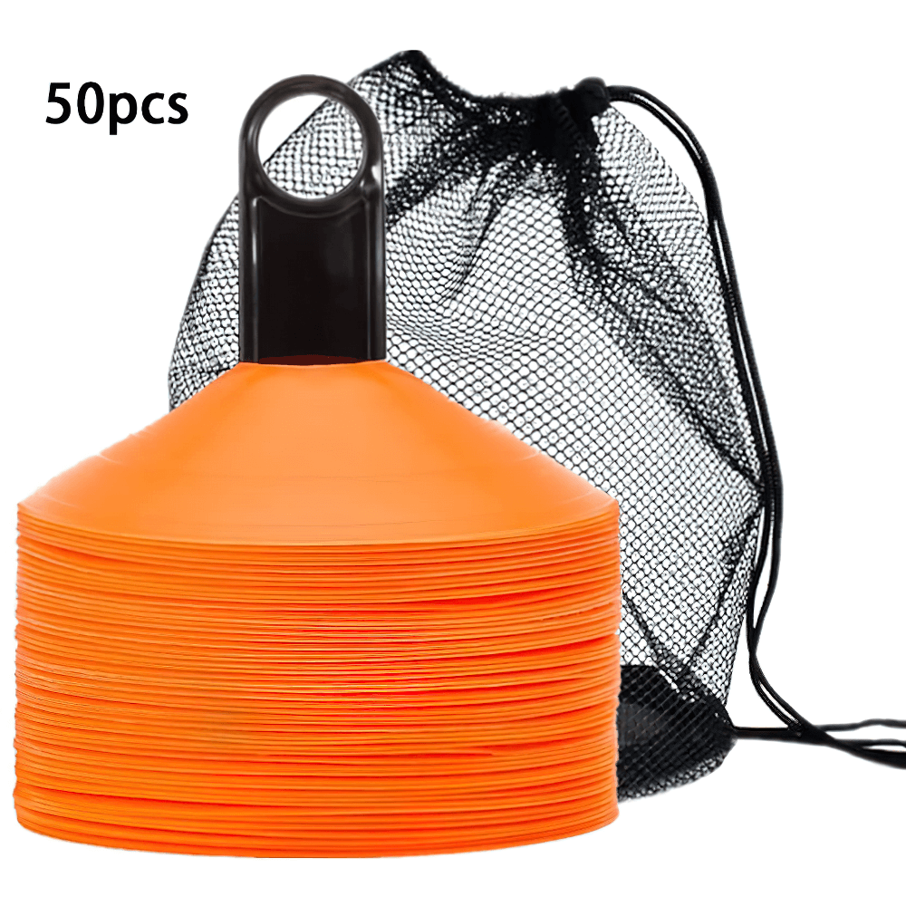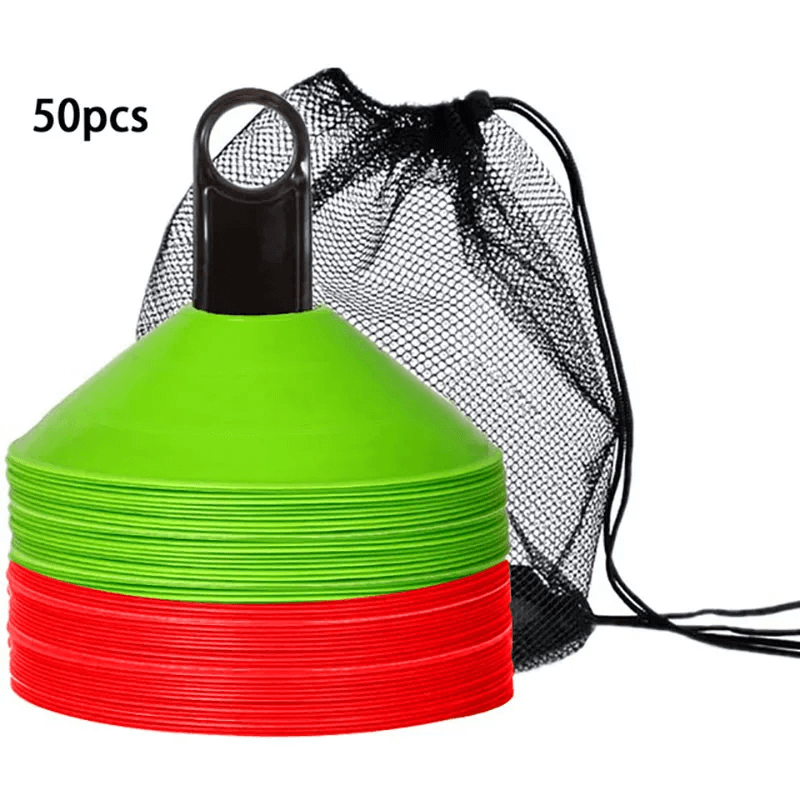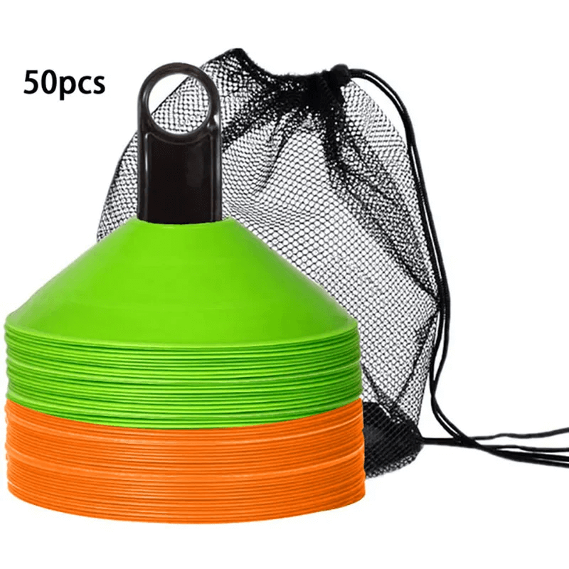 This set of 50 vibrant agility cones comes with a convenient carry bag for easy transport. Perfect for football, soccer, and other sports training, these cones are designed to help with agility drills, marking boundaries, and setting up courses. Their durable plastic construction ensures they can withstand repeated use in outdoor conditions. Ideal for both kids and adults.