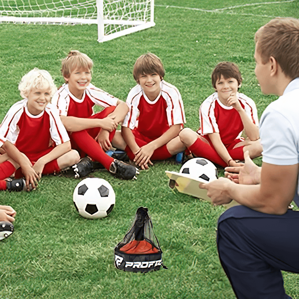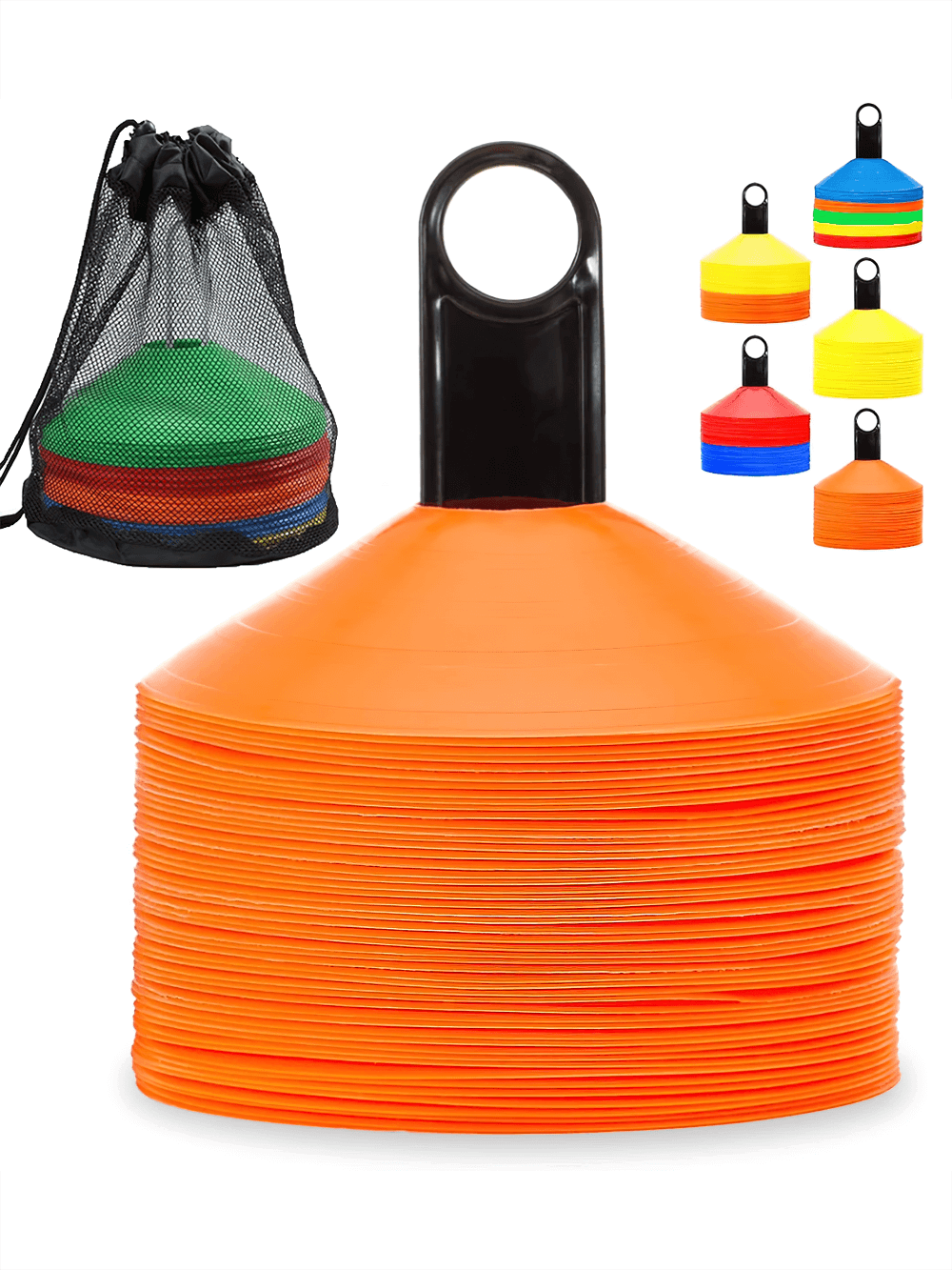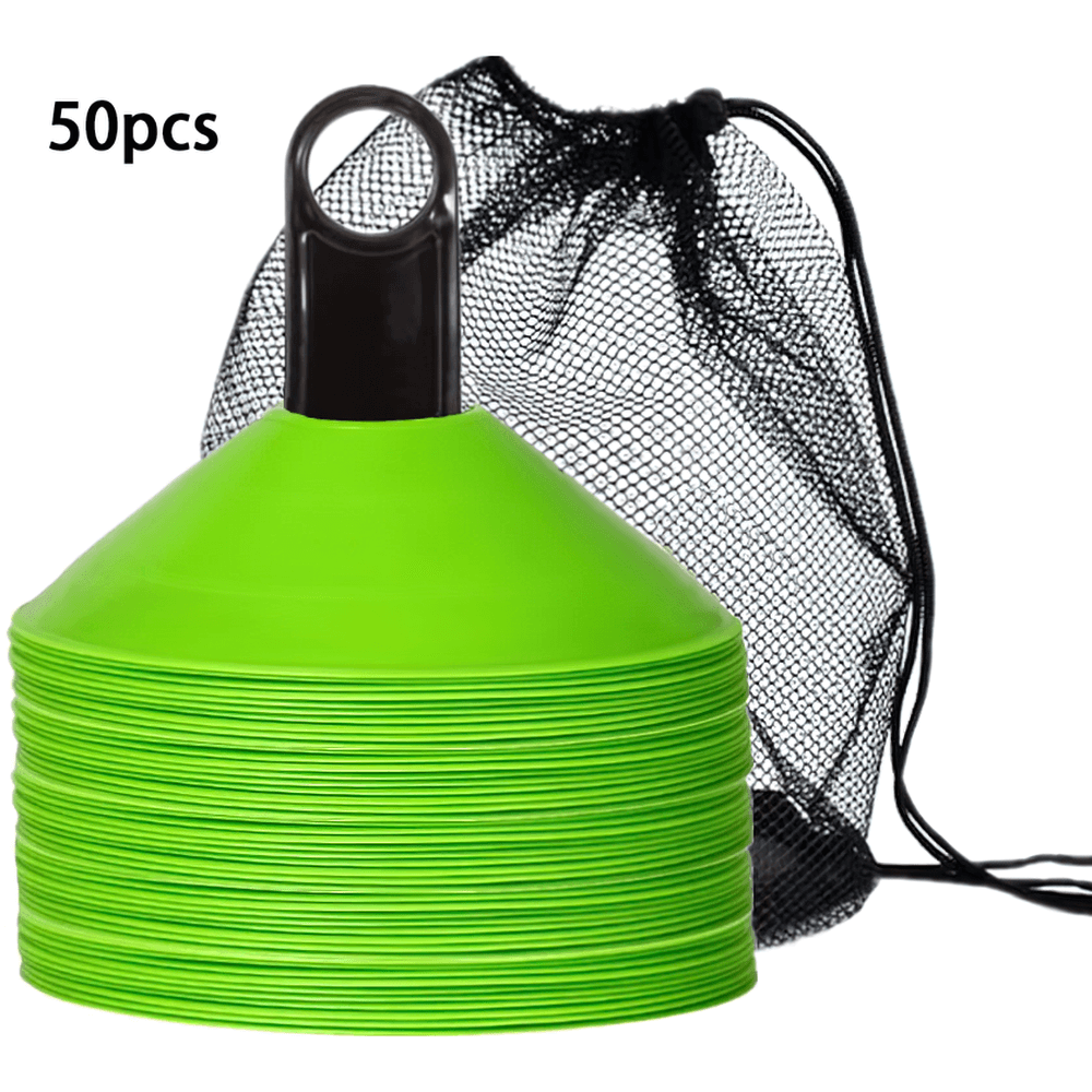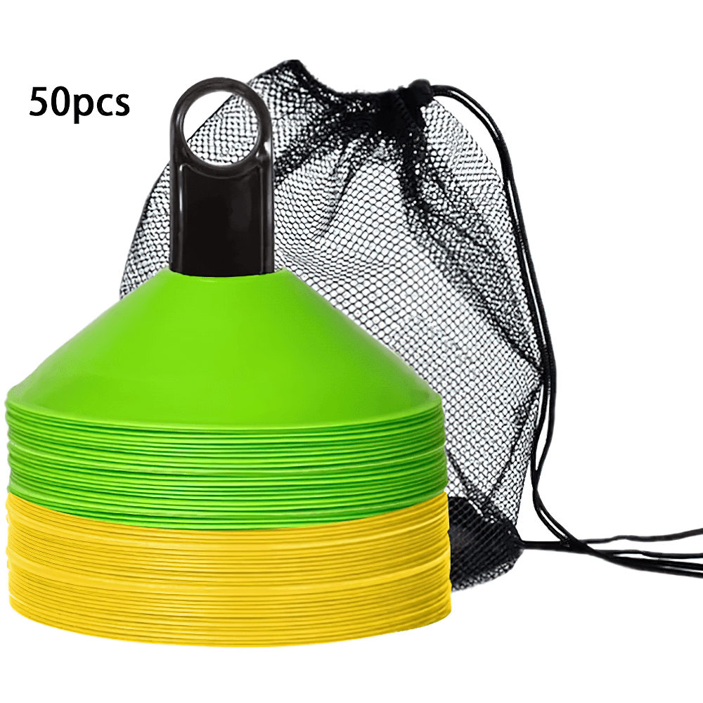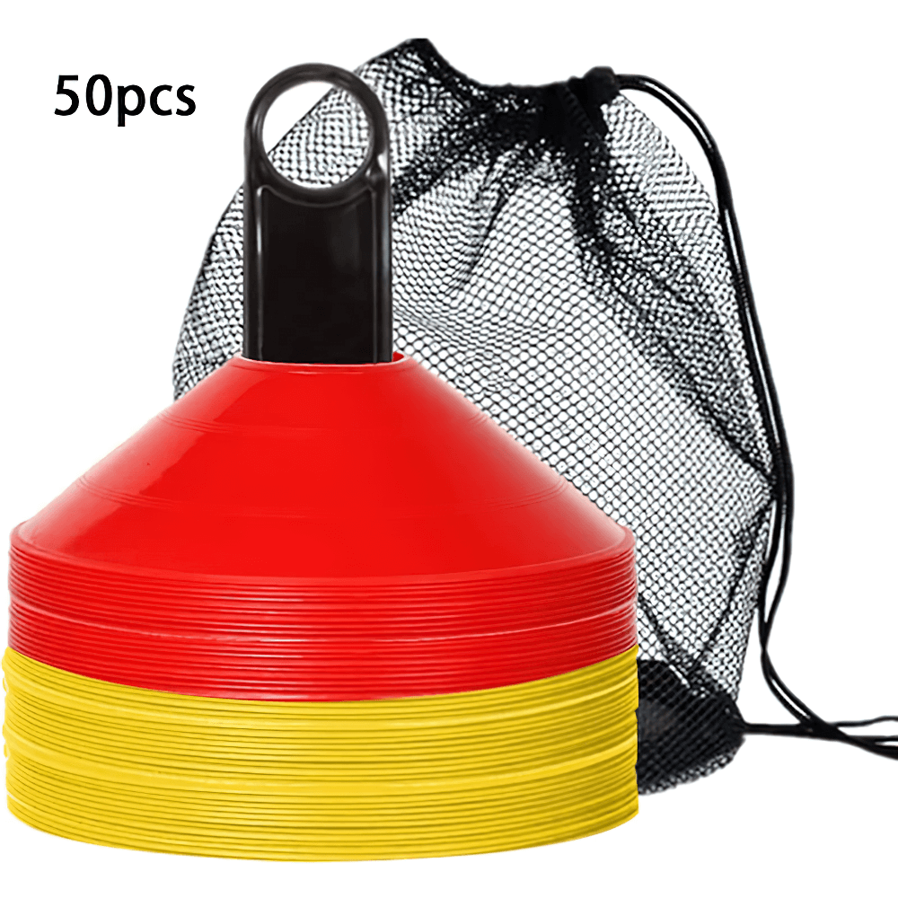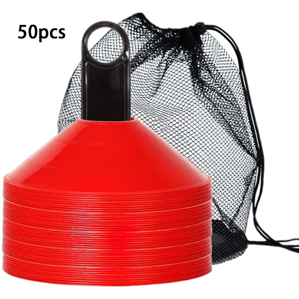 This set of 50 vibrant agility cones comes with a convenient carry bag for easy transport. Perfect for football, soccer, and other sports training, these cones are designed to help with agility drills, marking boundaries, and setting up courses. Their durable plastic construction ensures they can withstand repeated use in outdoor conditions. Ideal for both kids and adults.