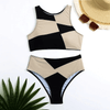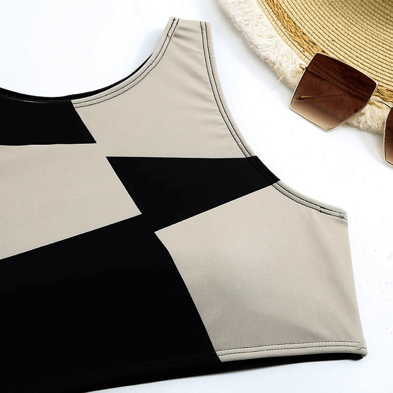 Unser modischer zweiteiliger Badeanzug ist auf Komfort und Leistung ausgelegt. Es besteht aus einer weichen, atmungsaktiven Mischung aus Polyester, Nylon und Elasthan und bietet optimale Elastizität und Halt. Mit seinem geometrischen Muster, dem mittelhohen Schnitt und dem kabellosen Design ist dieser stilvolle Badeanzug perfekt für den Strand oder den Pool.