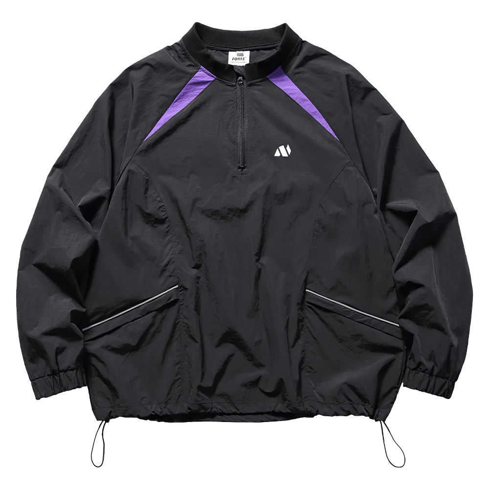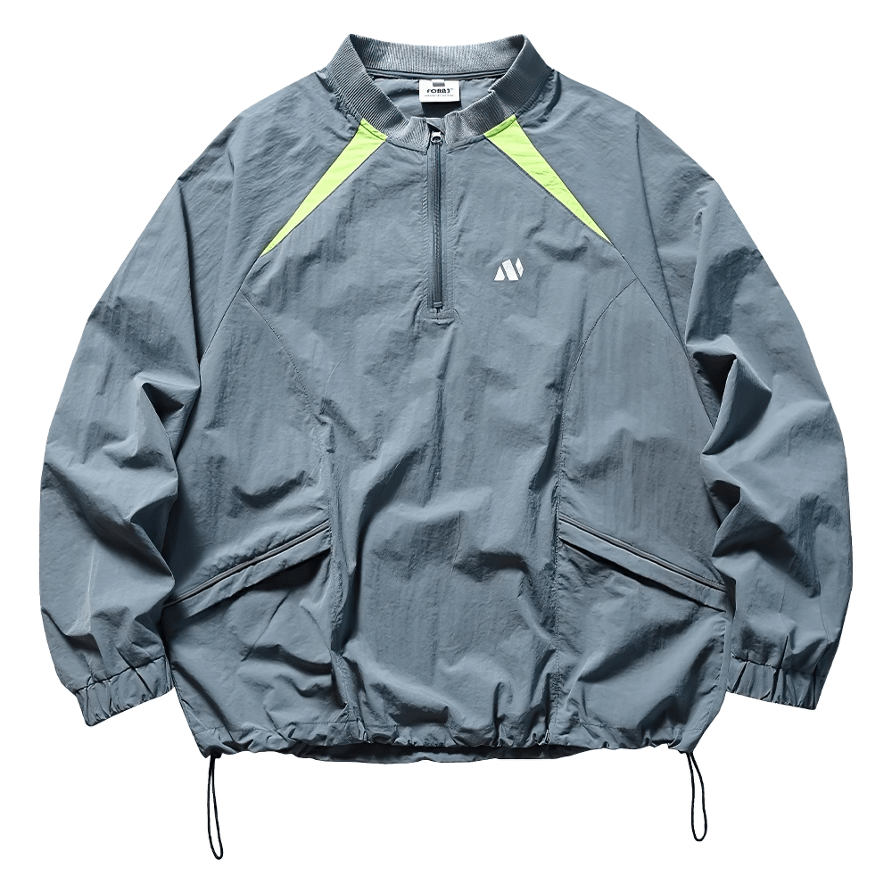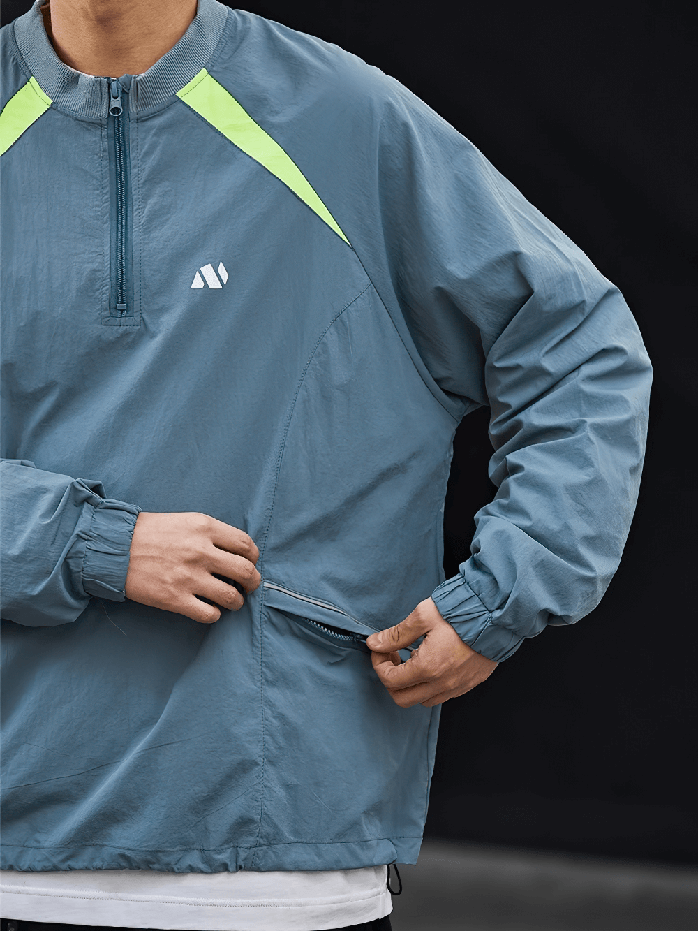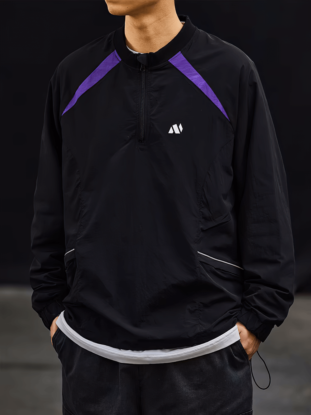 Elevate your streetwear style with this lightweight half-zip sports jacket. Crafted from durable polyester, it features a modern crew neck design, patchwork accents, and a convenient zipper closure. Ideal for casual outings or sports activities, this regular-fit jacket offers a sleek and trendy look with conventional cuffs and a thin yet sturdy construction. Perfect for everyday wear.