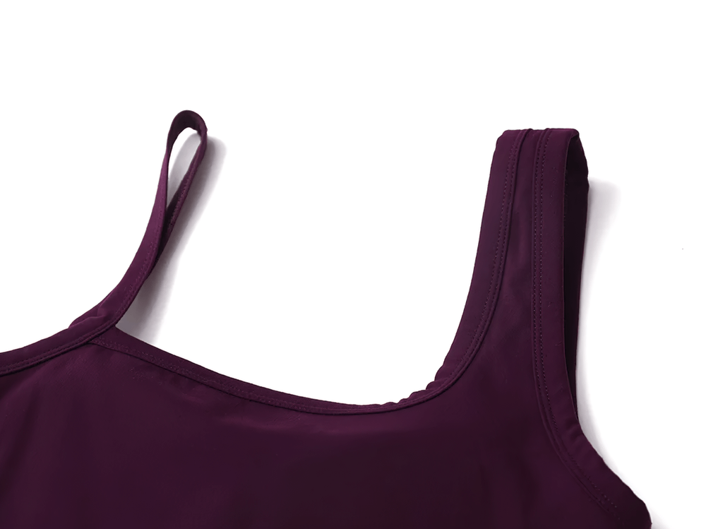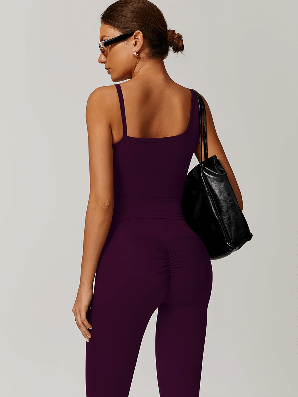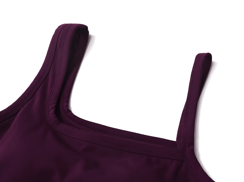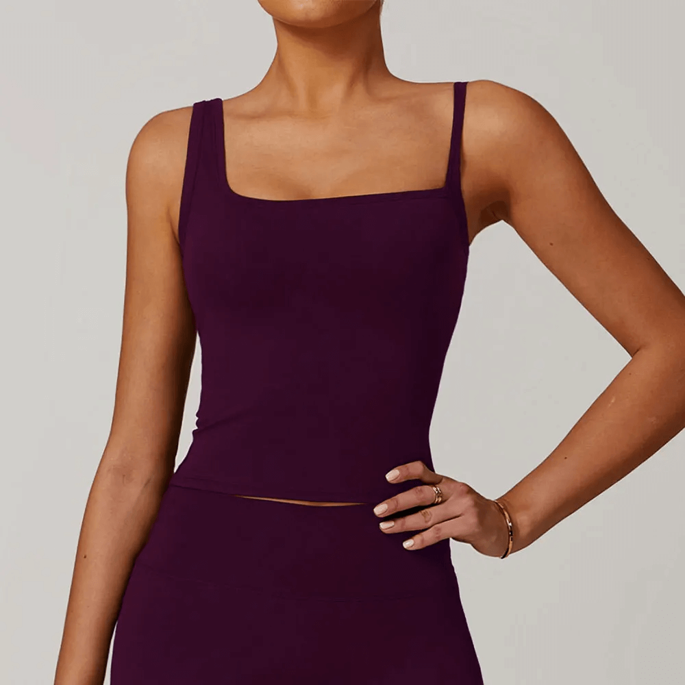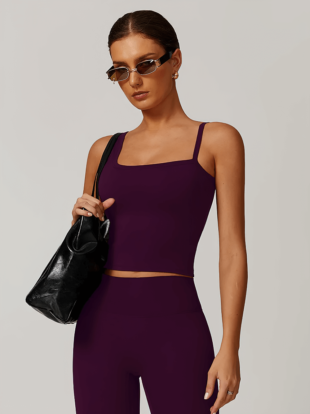 Upgrade your wardrobe with this square-neck crop tank top, featuring a built-in padded bra for added support. Designed for active and casual wear, its smooth, breathable fabric enhances flexibility and style. The minimalistic straps and chic design make it ideal for workouts or casual days. Available in a striking deep purple shade, it blends function and fashion for every occasion.