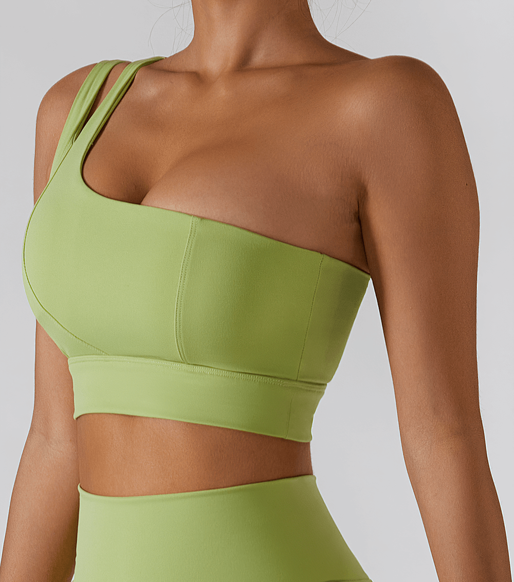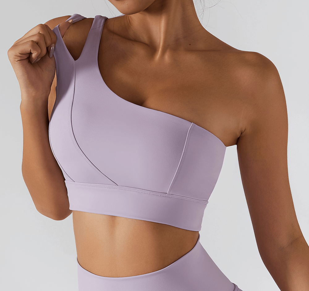 Elevate your workout with this one-shoulder sports bra, crafted from nylon and spandex for a breathable, supportive fit. Perfect for running, yoga, cycling, and fitness trends, this sleek design ensures durability and freedom of movement. Featuring a push-up effect and versatile seasonal wear, it is your go-to bra for sports or athleisure. Stay stylish and supported during every activity.