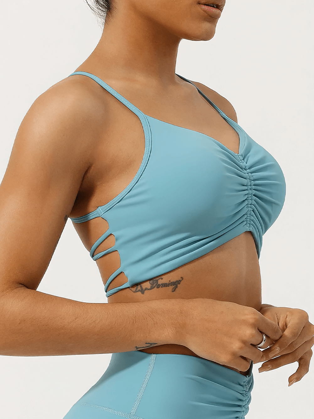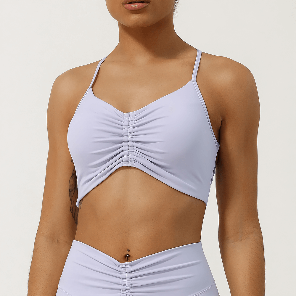 Elevate your workout with our Ruched Sports Top. This top features unique back straps and a ruched front that enhances its visual appeal while offering support. Its smooth fabric ensures mobility for any activity. A stylish and functional choice for gym enthusiasts and active individuals.