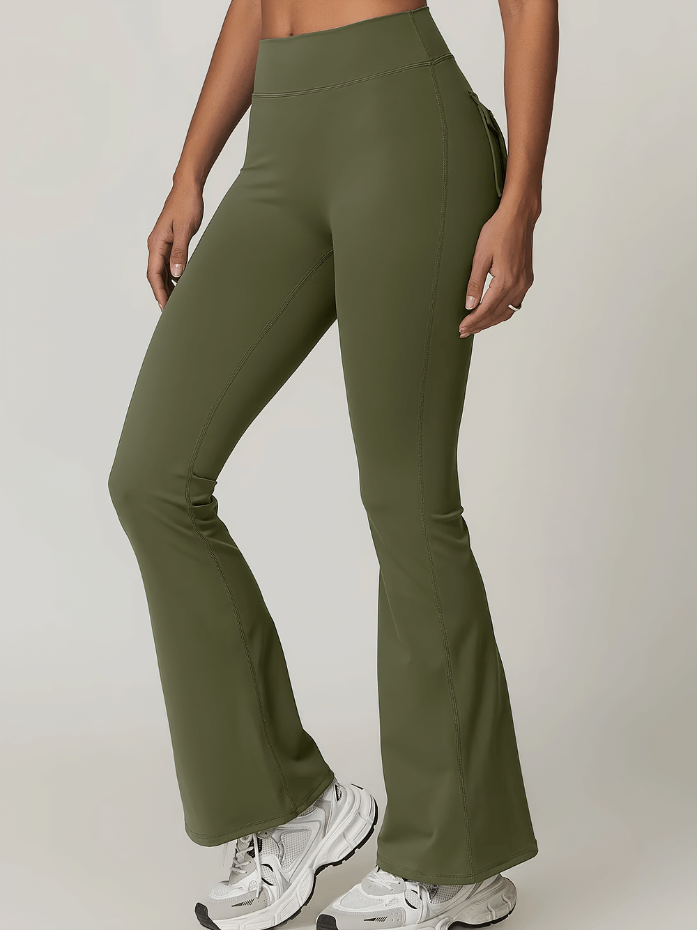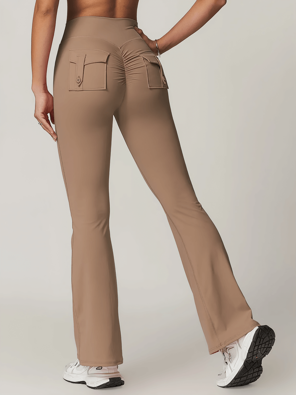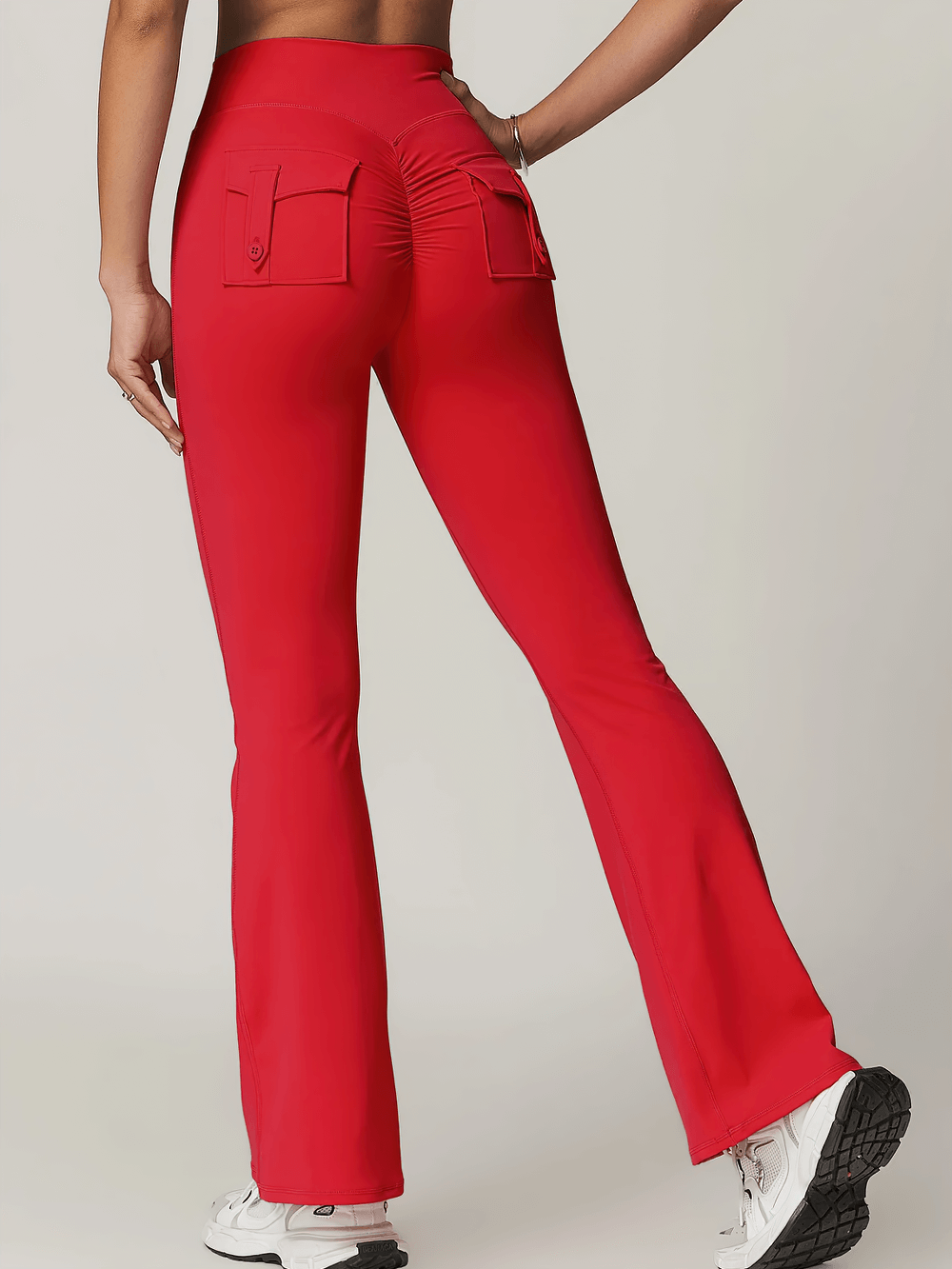 Elevate your workout look with these stylish yoga pants featuring a bell-bottom design and a flattering scrunch butt detail. The high-waist fit enhances support while the convenient side pocket keeps essentials close during fitness sessions. Made with breathable fabric, these leggings are perfect for yoga, gym, and casual wear. Move freely and stay chic with these functional and fashionable sports tights.