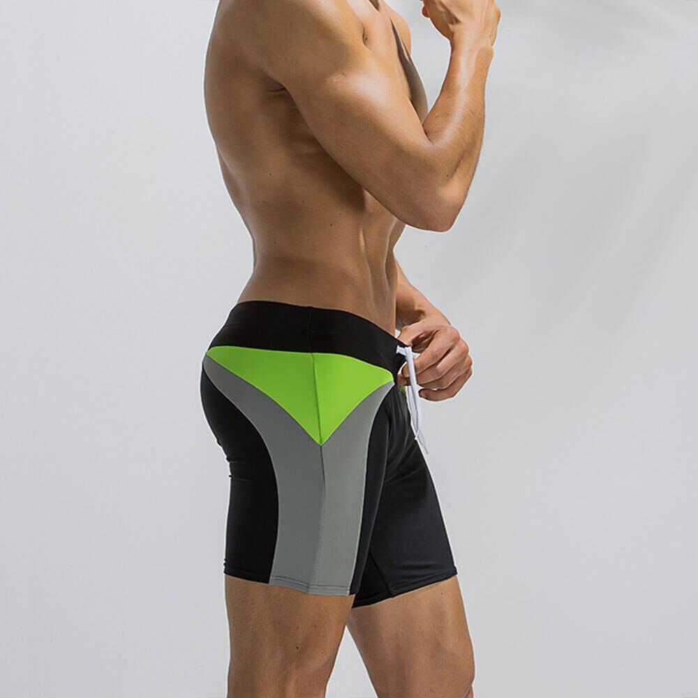 This men's swimming trunk is perfect for beach days. Made from lightweight polyester, it features a drawstring closure and patchwork design. Its long length provides increased coverage, superior comfort, and moderate sun protection.