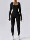 Enhance your workout with this seamless yoga suit, featuring thumb holes on sleeves for extra practicality during fitness routines. Designed for active women, this jumpsuit offers a flattering fit and unrestricted movement. Ideal for yoga, gym, or casual athleisure, its stretchable fabric ensures durability and a sleek look. Upgrade your fitness wardrobe with this stylish and functional piece.