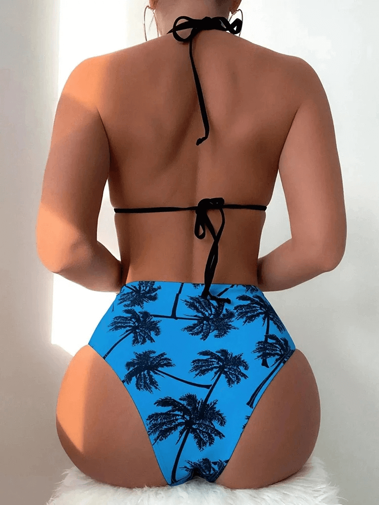 Dive into style with our Tropical Print Bikini, adorned with a lush palm design and striped detail for a modern twist. The adjustable halter top ensures a perfect fit while the mid-rise bottoms offer just the right amount of coverage. Whether you’re lounging by the pool or exploring beachfront vistas, this two-piece swimwear is your ticket to sun-soaked style and effortless elegance. Make waves this season – paradise is waiting.